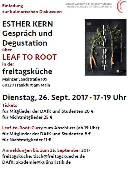 Auf Einladung der Deutschen Akademie für Kulinaristik kommt am 26. September Foodexpertin Esther Kern, Autorin des vielgelobten Buchs und Esskulturprojekts "Leaf to Root" (hier klicken), nach Frankfurt/M in die Freitagsküche.